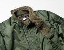 従来のMA-1ではフロントファスナー部や首元からの外気の侵入を防げず、ネックウォーマーやマフラーなどの防寒アイテムが必要でしたが、着脱式フロントエアガードカラーを装着することで、外気の侵入を最小限にシャットアウト、また内衿部分はマイクロフリースナッピング素材を使用し保温性はもとより装着感にも優れています。ファスナーはアメリカTARON社製を採用した本格派MA-1ジャケット。