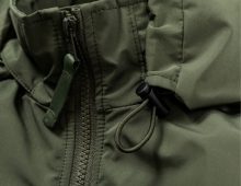 フードは襟の内側に畳んで収納することが可能、またばたつき軽減としてベルトで固定することが出来ます。