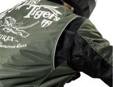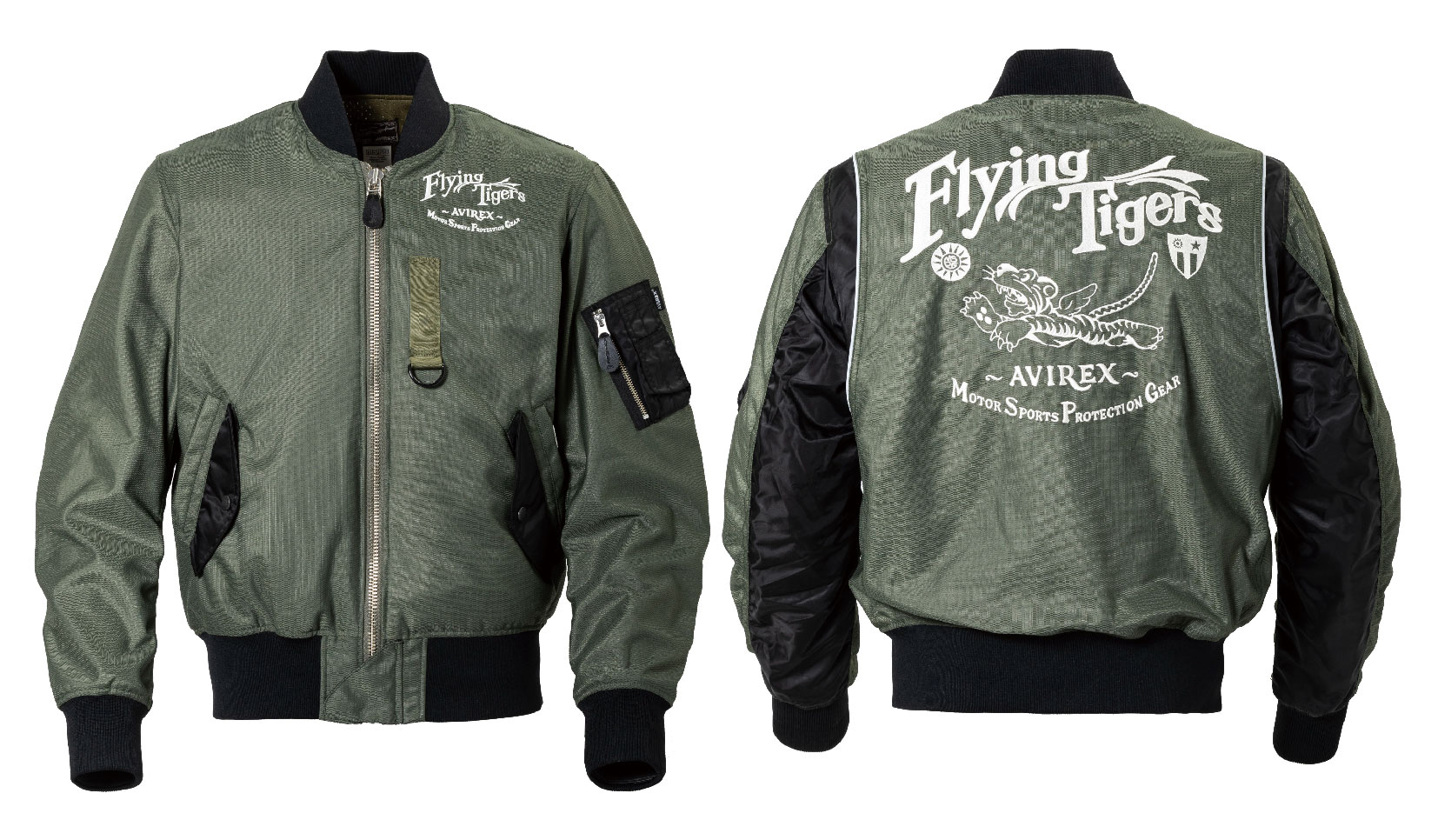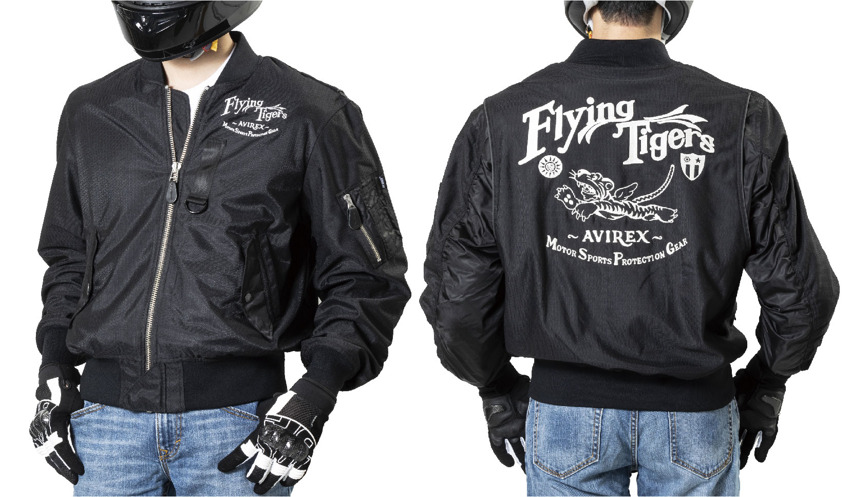「FLYING TIGERS」のグラフィックを胸と背中に刺繍、仕様は軽量で強靱なハニカム構造のエアメッシュ素材と衣服内の風の通り道を確保するWIND PATH SYSTEM LININGを採用しライディング時の腕の前振りがしやすいアクションプリーツ、脇ポケットはフラップ式・片玉縁式のダブルポケットで、鍵など貴重品を取り付け可能なキーフックを装備。左胸にはオキシゲンタブとミリタリーテイストのデザイン。肩・ヒジ・背中にはCE規格のプロテクターを標準装備し、胸部には別売りの胸部パッドが装着可能。