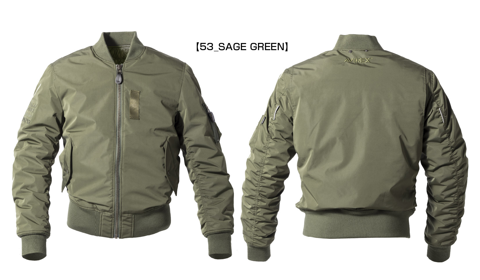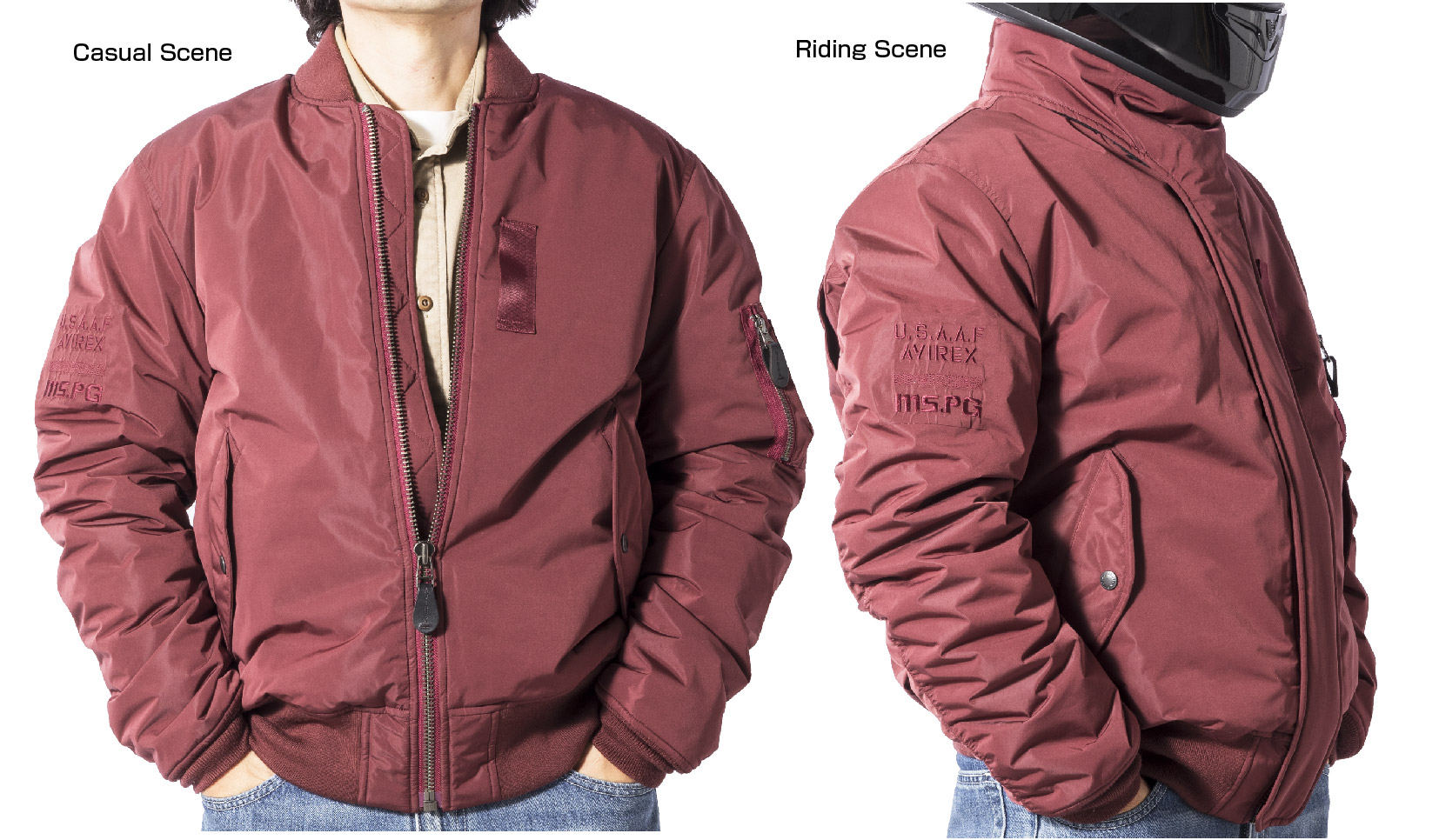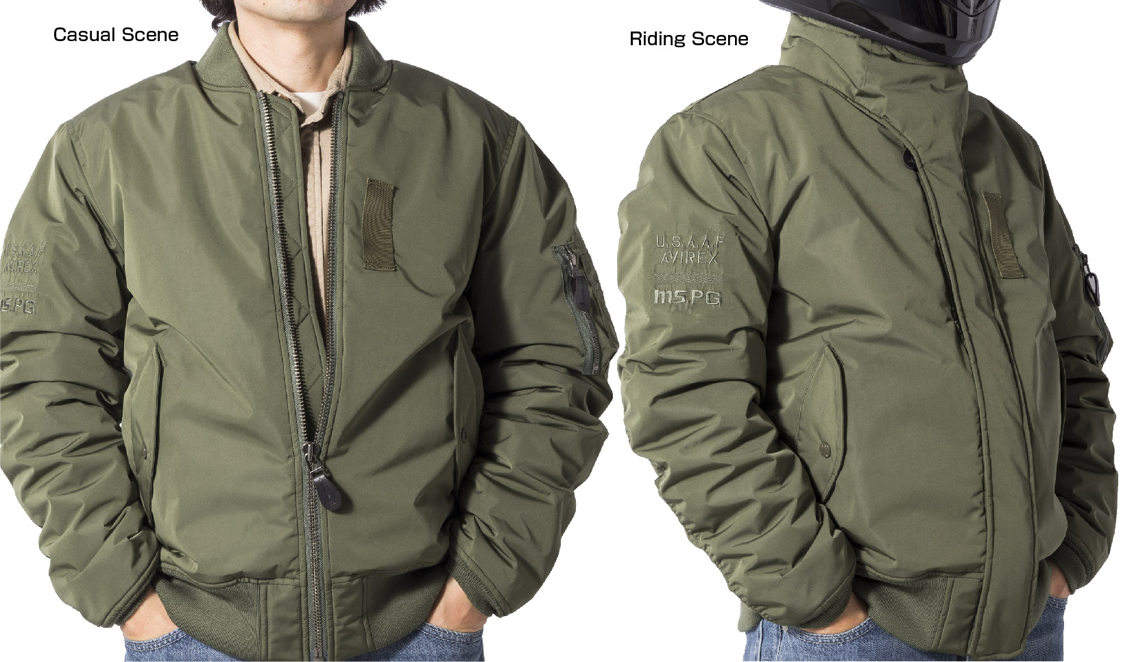 A2M1001 AVIREX MA-1 RIDING BLOUSON Y-WARM MODELは、バイクライディングやアウトドア・カジュアルに最適なアウターウェアです。撥水加工が施された表地は、急な雨や風からしっかりと守ってくれます。また特に寒い季節にも対応するため表地と中綿の間に断熱シート(Y-WARM)を設けることで、抜群の保温性を発揮します。