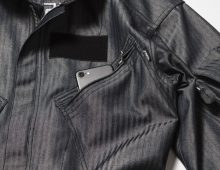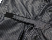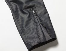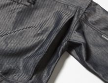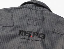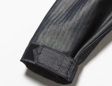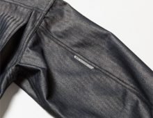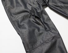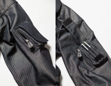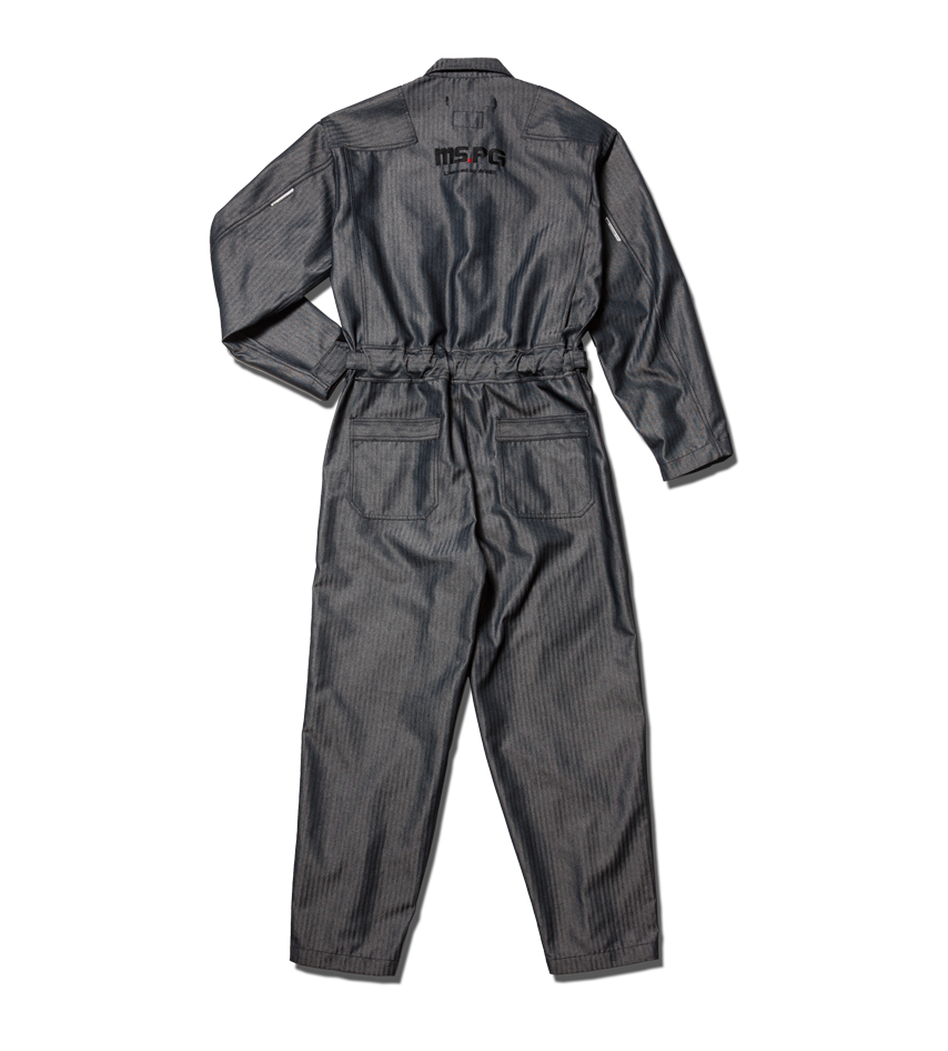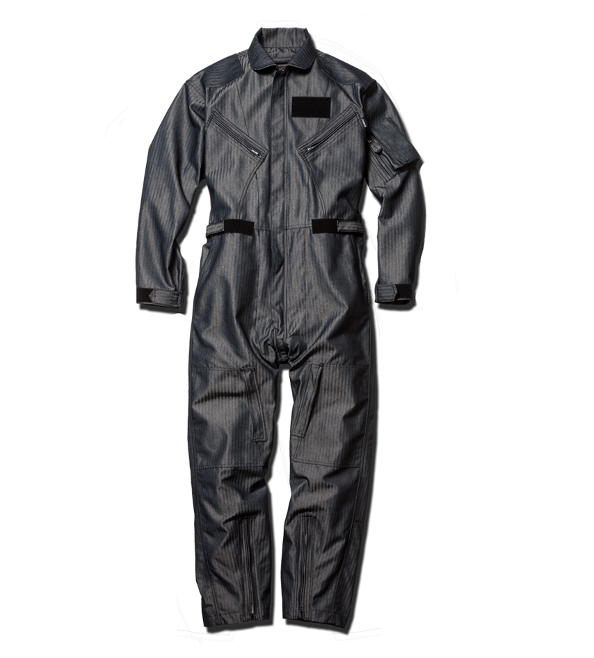 素材に炭素繊維(カーボンファイバー)を織り込むことによる制電性、メカニックスーツでは定番のヘリンボーンと言う織り組織による耐久性、その他収納力や各部の機能性を盛り込んだ一着。